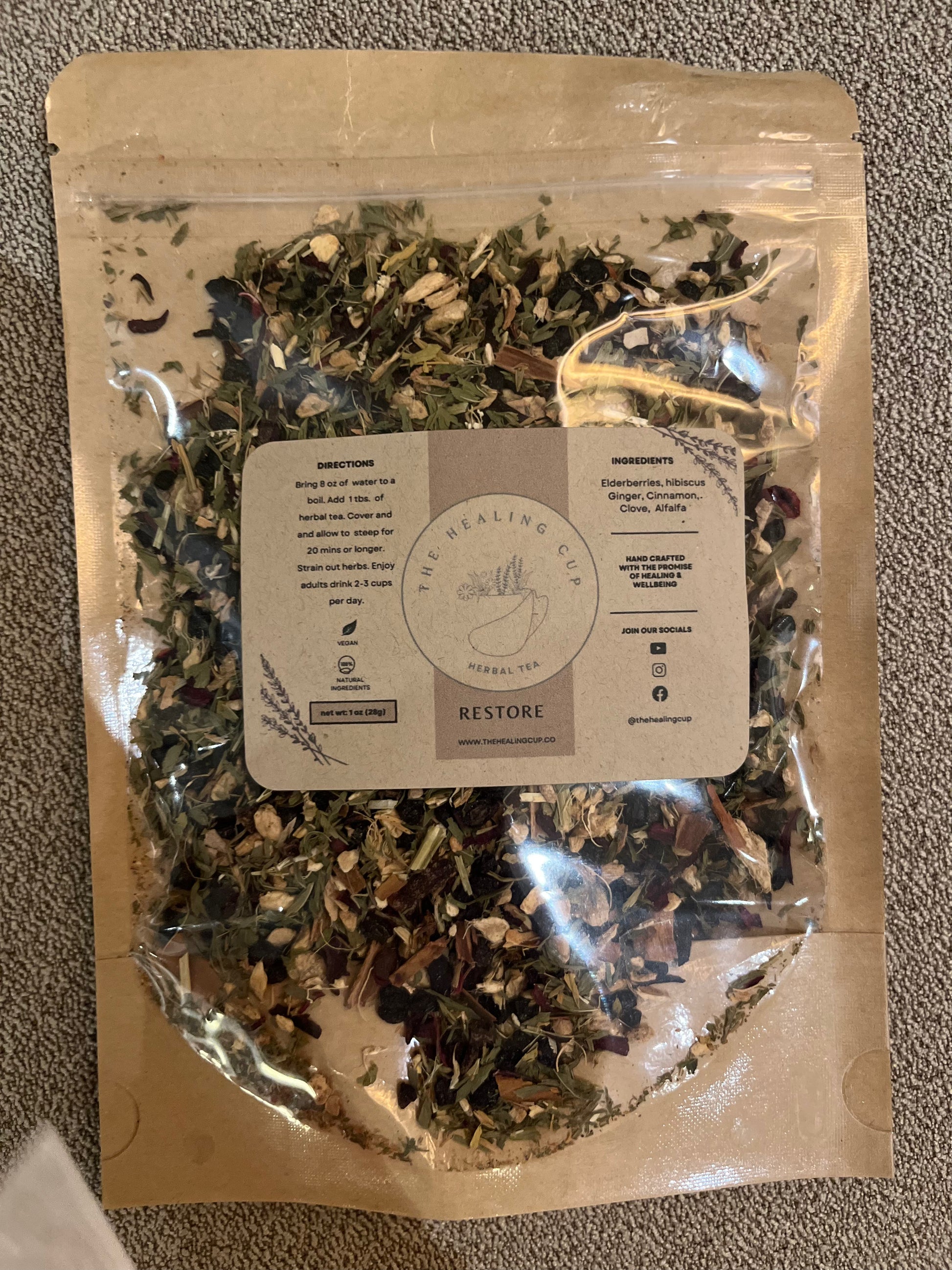 Restore is a hand crafted herbal tea blend created to rejuvenate your body and strengthen your immune system. Packed with antioxidant-rich herbs and warming spices, this tea supports digestion, circulation, and overall vitality while helping the body fight seasonal imbalances. Its tart, fruity flavor with a touch of spice makes it both comforting and refreshing — perfect for daily wellness.
